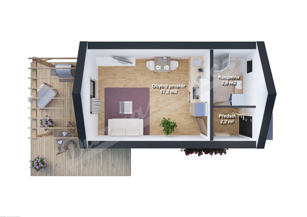 Vstupní hala, obytný prostor s kuchyní a se vstupem na terasu, koupelna s toaletou