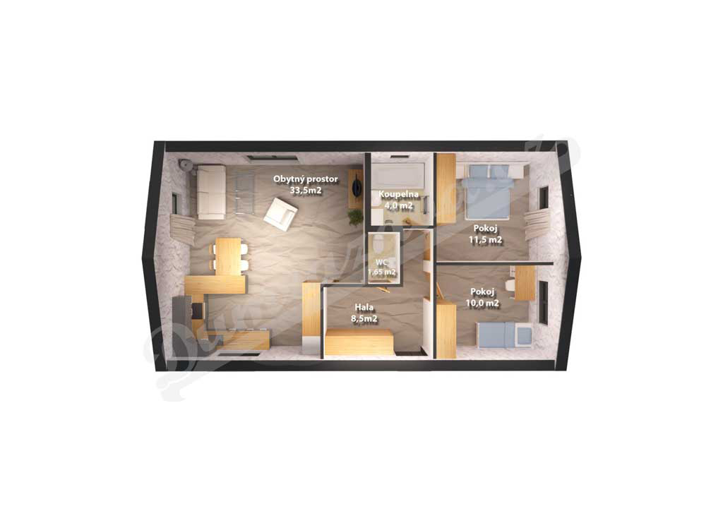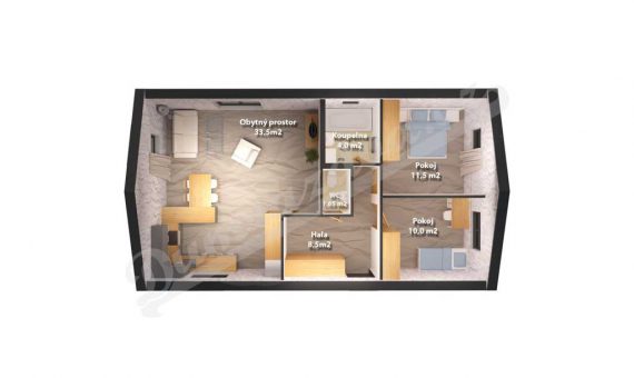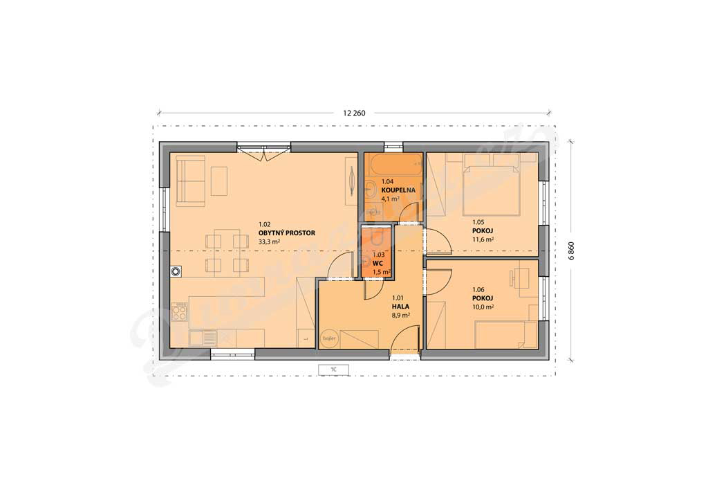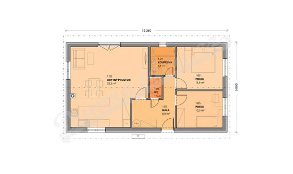 vstupní hala, obývací pokoj spojený s kuchyní, ložnice, pokoj, koupelna a WC