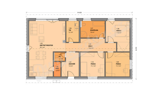 Zádveří, hala, obytný prostor s kuchyní a vstupem na terasu, 3 pokoje, koupelna, WC, technická místnost, sklad