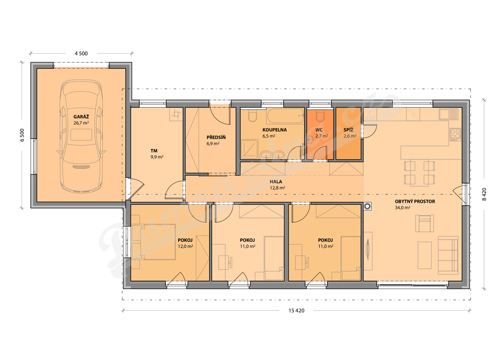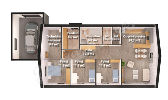 Předsíň, hala, obytný prostor s kuchyní a vstupem na terasu, 3 pokoje, koupelna, WC, technická místnost, sklad, garáž