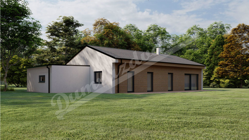 Rozdíl mezi základní a rozšířenou verzí Bungalovu 14 je zjevný – garáž jen tak nepřehlédnete. Vejde se do ní jedno auto a spolu s technickou místností nabízí další prostor pro drobné práce nebo uskladnění větších věcí. Okno v technické místnosti se mění na dveře, jinak vše zůstává stejné. Obytné místnosti odděluje od technické části domu prostorná hala, všechny pokoje jsou orientovány jedním směrem a mají francouzská okna pro vstup na terasu. Přírodní dřevěné obložení fasády vybízí k připojení pergoly.
