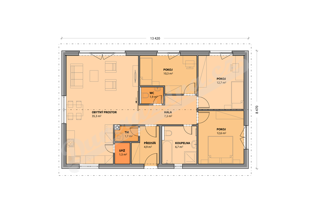 Předsíň, hala, obytný prostor s kuchyní a vstupem na terasu, 3 pokoje, koupelna, WC, technická místnost, sklad