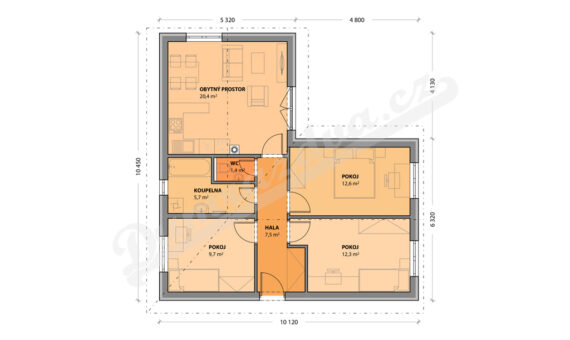 Tento rodinný dům vznikl zvětšením Bungalovu L o skoro 10 metrů čtverečních. Díky tomu jsme mohli ložnici z původního projektu rozdělit na dva samostatné pokoje a vytvořit tak komfortní bydlení i pro čtyřčlennou rodinu. Dům se hodí do nízké zástavby a vejde se na relativně malý pozemek. Půdorys ve tvaru písmene L vytváří příjemné zákoutí ideální pro venkovní posezení.
