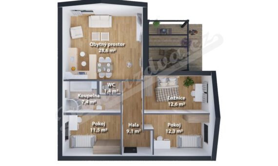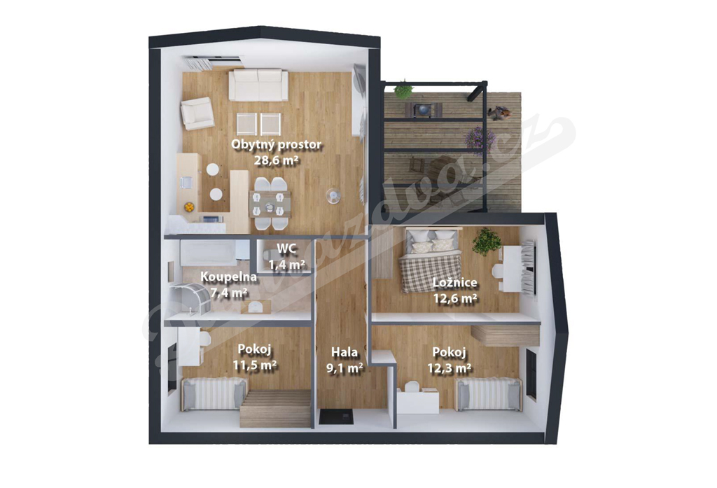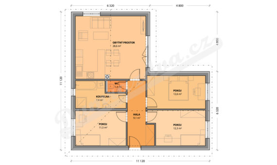 Hala, obytný prostor s kuchyní a vstupem na terasu, 3 pokoje, koupelna, WC