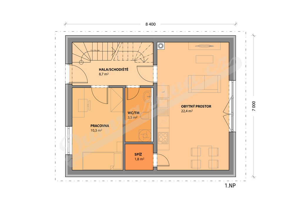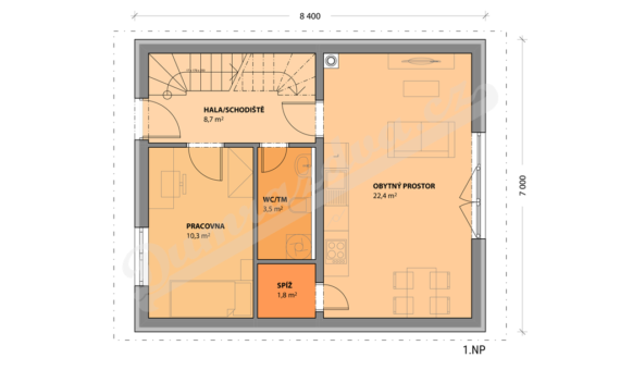 Přízemí – Vstupní hala, obytný prostor s kuchyní se vstupem na terasu, koupelna, pokoj