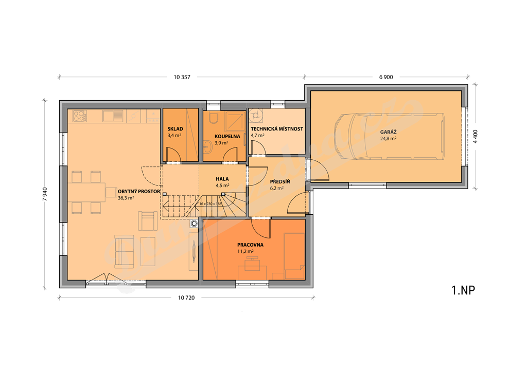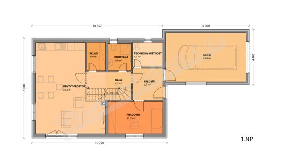 Přízemí – Vstupní hala, obytný prostor s kuchyní a se vstupem na terasu, pokoj, koupelna, sklad, technická místnost, garáž