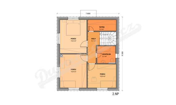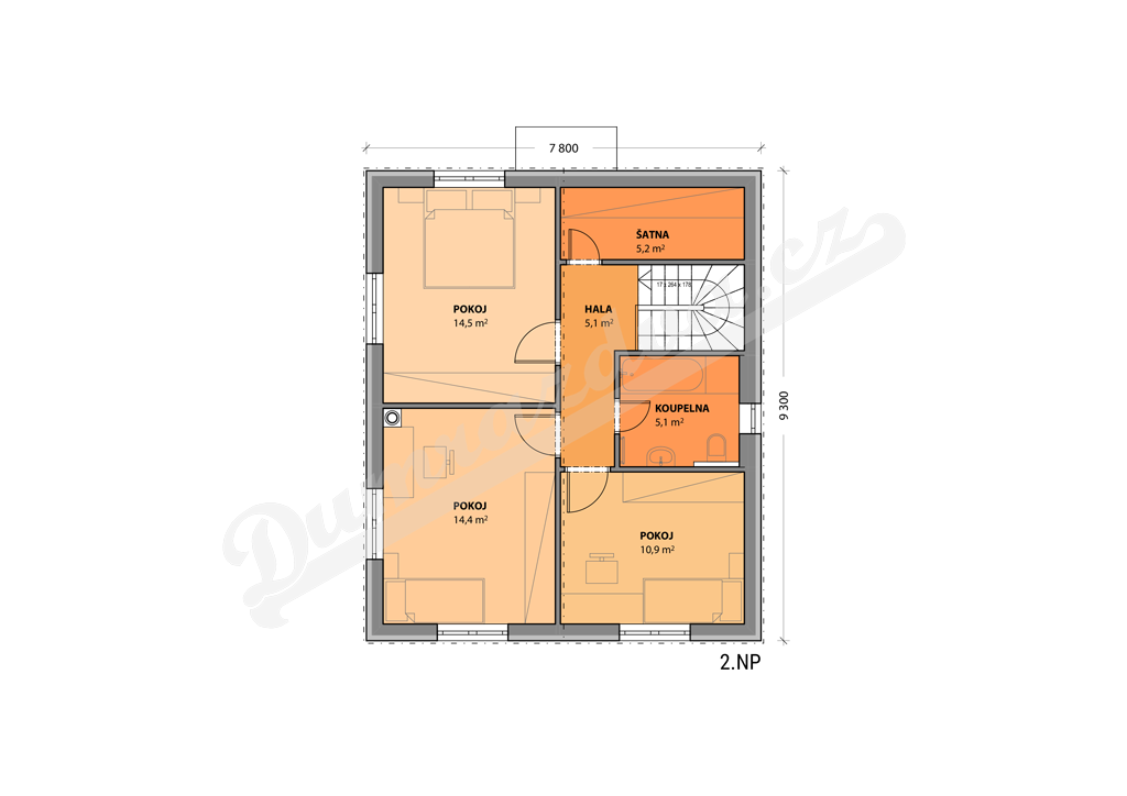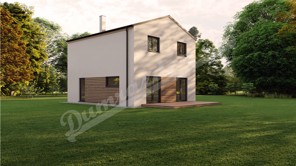 Tento podkrovní dům má všechno, co potřebuje k životu rodina se dvěma a více dětmi. Téměř polovinu zastavěné plochy tvoří obytný prostor, který je díky velkým francouzským oknům propojen přímo s terasou a zahradou domu. Vzniká tak spousta místa pro setkávání většího počtu lidí. Současně ale dům nabízí dostatek soukromí – má čtyři ložnice a dvě koupelny.