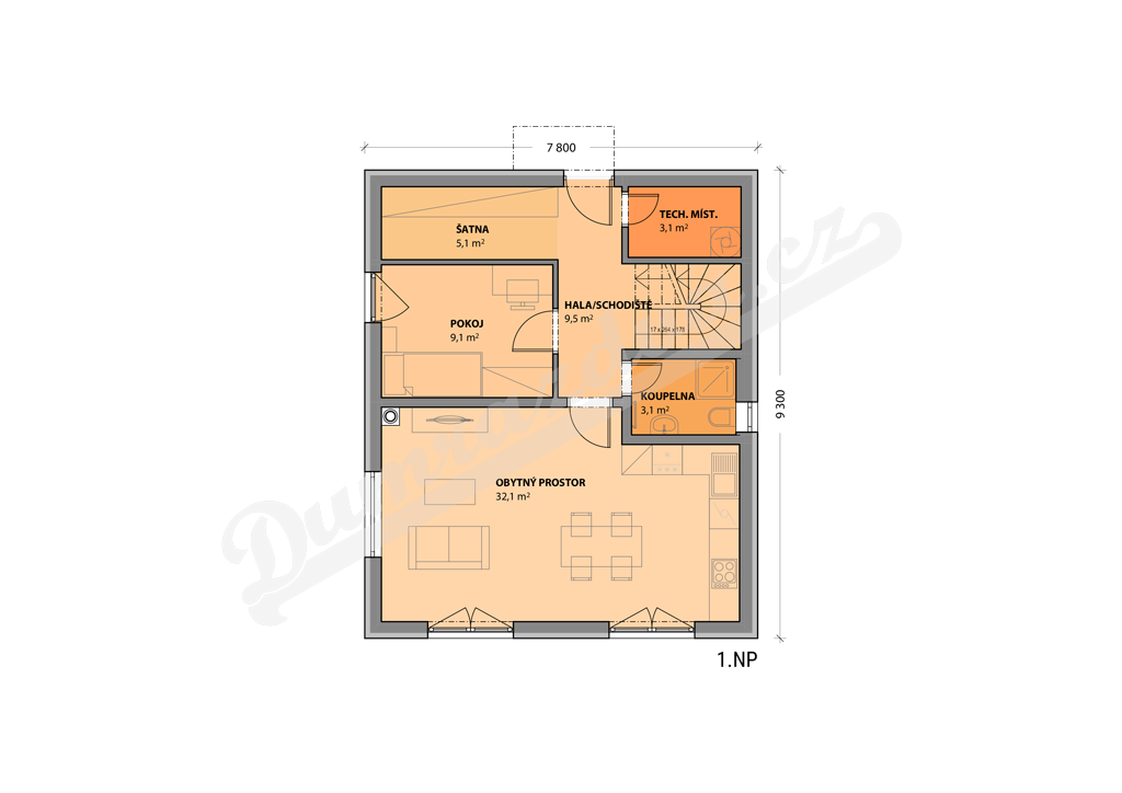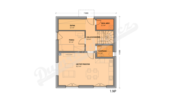 Přízemí – Hala, obytný prostor spojený s kuchyní s jídelnou a vstupem na terasu, pokoj, koupelna s toaletou, šatna, technická místnost