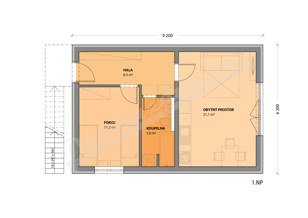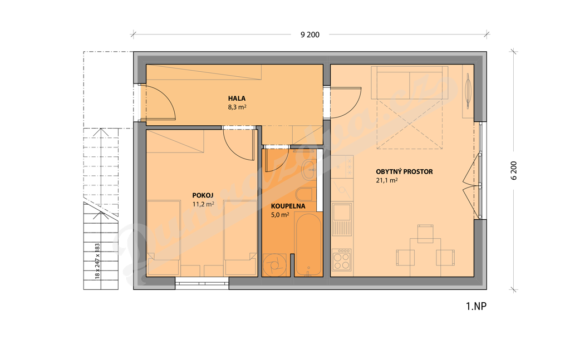 Patro – Vstupní hala, obytný prostor s kuchyní, pokoj, koupelna
