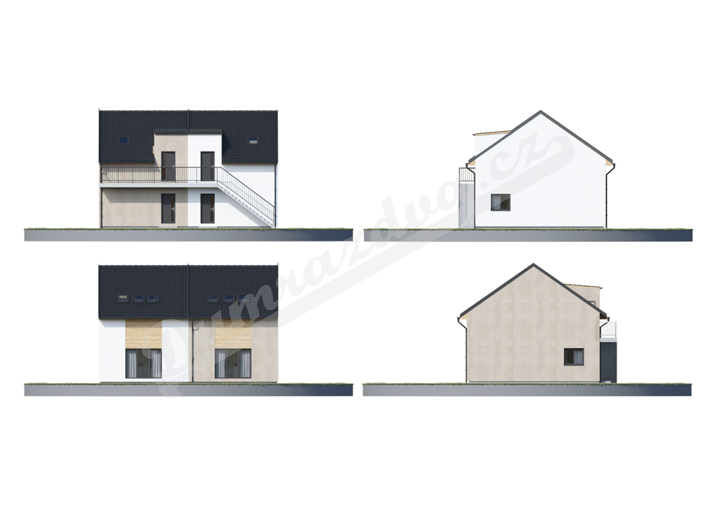 I tento náš projekt je řešením pro situace, kdy potřebujete postavit na malém pozemku dva malé byty. Je dostupný, je dvojpodlažní, je malometrážní a dá se pojmout i jako řadový dům. Každá z bytových jednotek má svůj vlastní vchod – jedna z ulice, druhá nad kovovým schodištěm jako z amerického filmu. Zkrátka věrná kopie Domu se dvěma byty A, ale větší, a tedy ještě úžasnější.