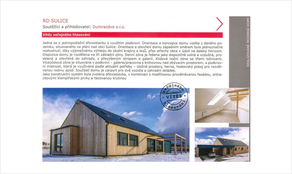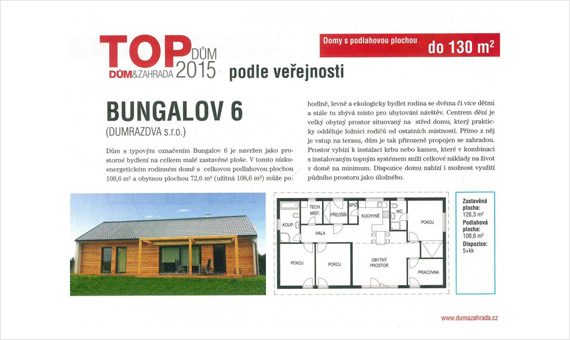 V 15. ročníku soutěžní přehlídky TOP DOMY 2017 časopisu DŮM A ZAHRADA, v kategorii domů s podlahovou plochou do 100m2, zvítězila naše společnost Důmrazdva ve veřejném hlasování s katalogovým domem Bungalov 9 a jeho realizací ve Velkých Tešanech. Děkujeme všem za podporu a ocenění naší práce.