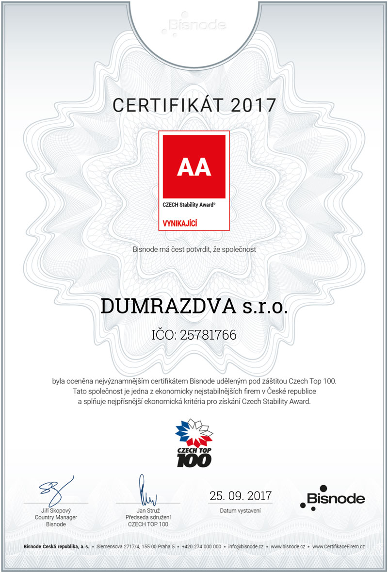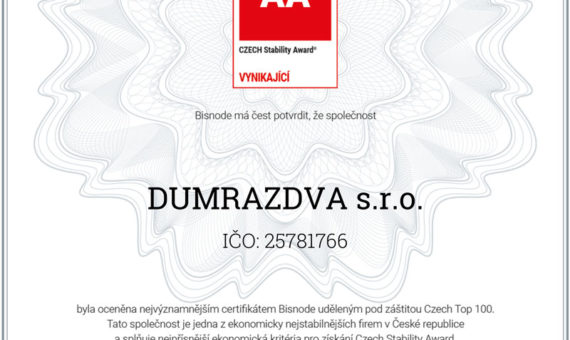 Czech Stability Award Certifikace vypovídá o nadstandartní ekonomické kondici, solventnosti a spolehlivosti. Naše společnost Důmrazdva tak patří mezi  0,12 % firem, které na ocenění dosahují.