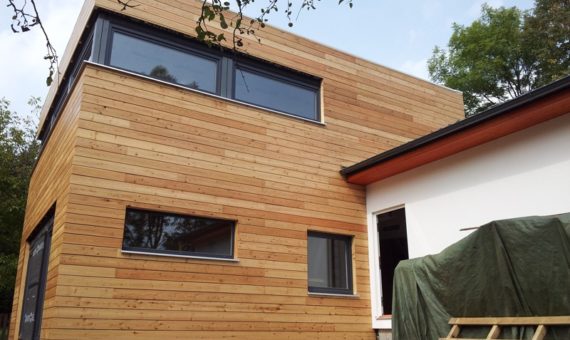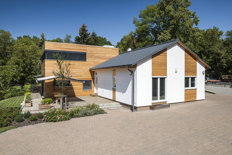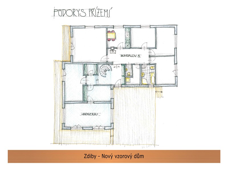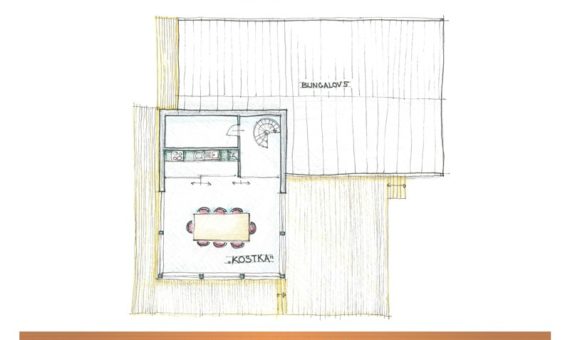 Bungalov 5+ je postavený v našem standardním provedení s velkoformátovou plechovou krytinou na sedlové střeše a fasádním systémem s akrylátovou omítkou, doplněným palubkovým obkladem kolem oken. Do části jeho půdorysu je vsazena patrová „Kostka“ s provětrávanou fasádou s obkladem z modřínových prken a pultovou střechou s vrchní vrstvou ze sklolaminátu. Tuto vestavbu jsme pojali jako atypickou a to i co se týká samotných skladeb konstrukcí.