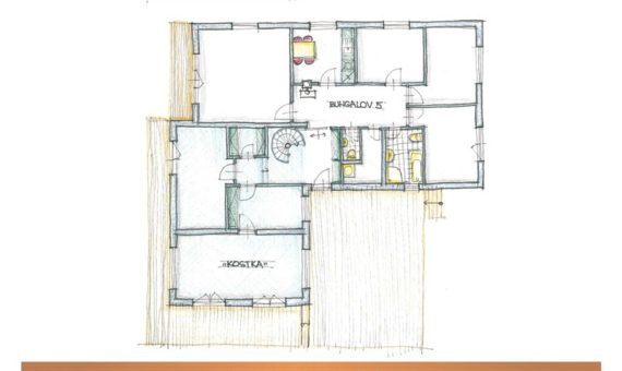 Domy mají společný vchod, v přízemí je zachována dispozice Bungalovu 5+, pouze do obytného prostoru zasahuje svou částí přístavba.